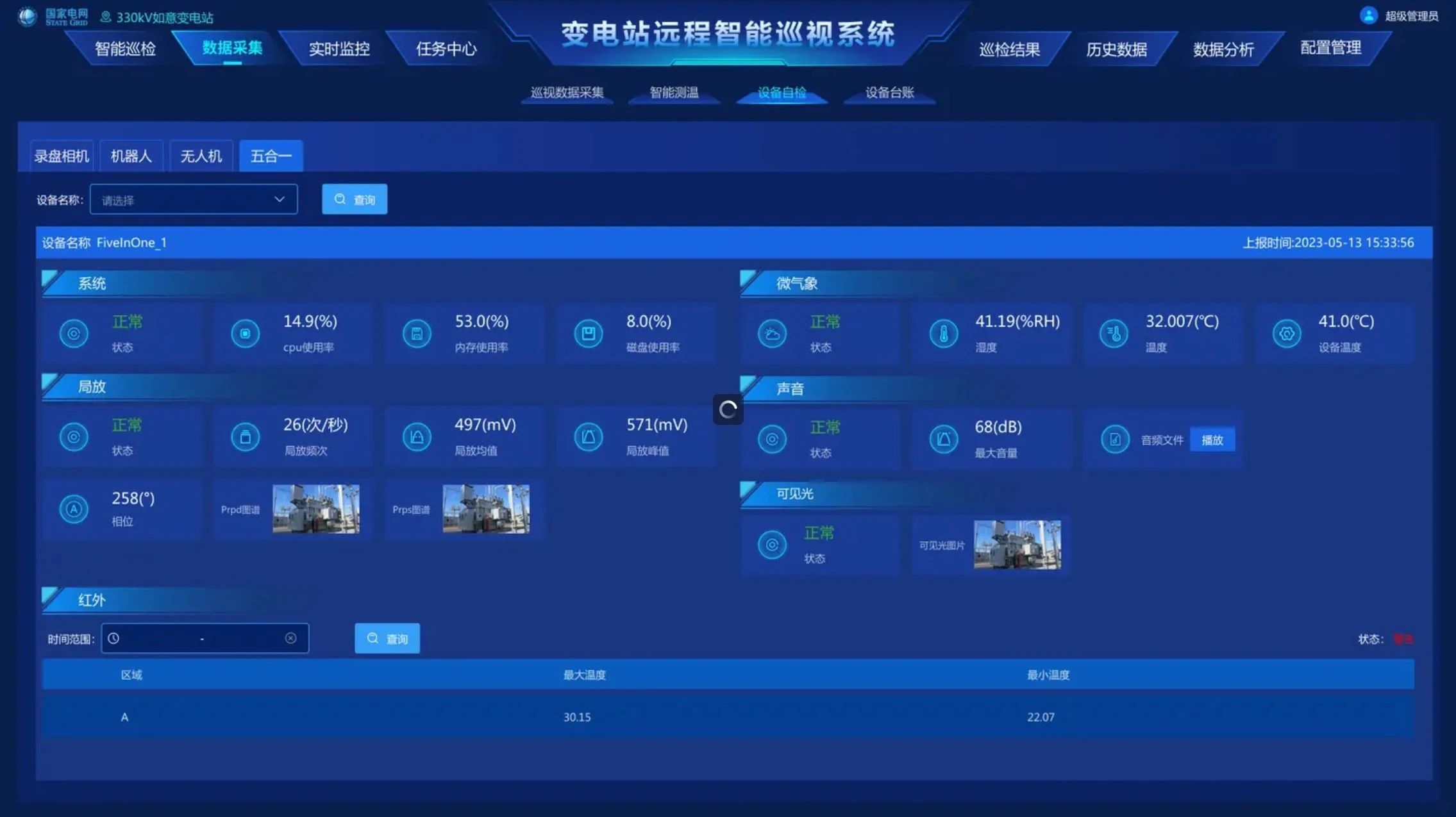 通過機器人系統、高清視頻系統、紅外在線系統、聲紋采集裝置等方式聯合采集巡視數據,完成變電站全面運行數據采集,構建數字化變電站數據基礎。具備表計識別、設備外觀識別功能完成30多類電力設備狀態分析,20多類典型缺陷識別,有效輔助人工完成現場巡視工作。
